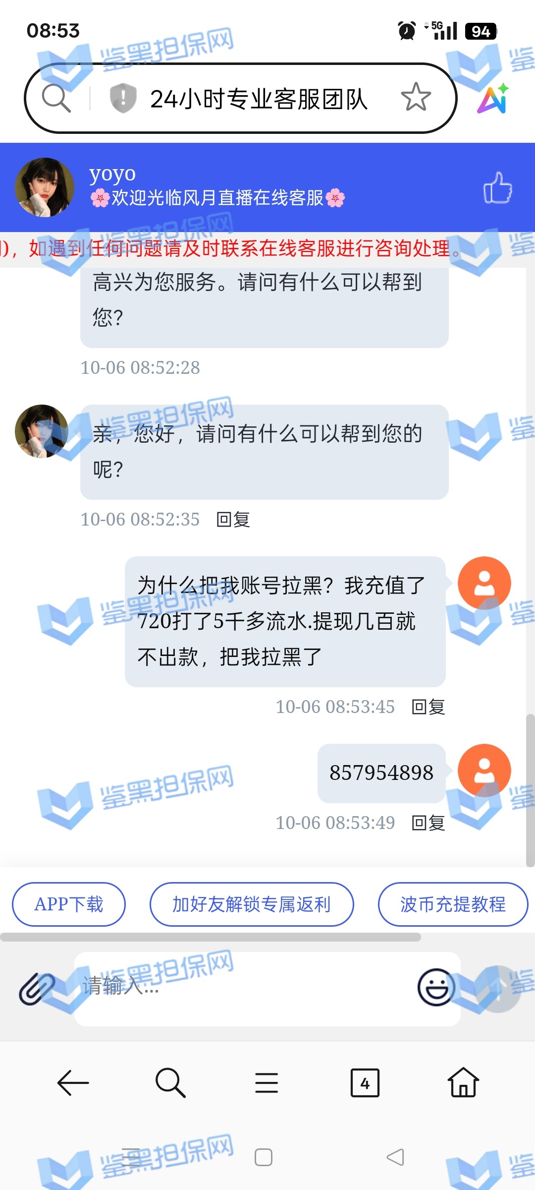 3、维权专员试图通过不同的渠道联系该娱乐城的相关负责人,均是告知套利异常投注行为后直接拒绝沟通,渠道全部被限制,可见这个色站赌博平台黑款意图十分明显, 且该色站连续被投诉曝光,还请广大玩家远离远离!!